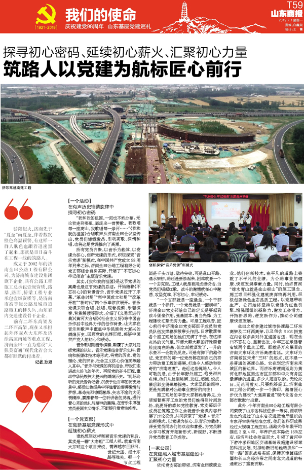 誰能想到這樣新穎音樂黨課的背后,其實是一群“大老粗”工程人呢。就拿濟南大東環這個項目來說,需跨越東巨野河、世紀大道、經十東路等難關,哪一個節點工程都是千頭萬緒、亟待突破,可是逢山開路、遇水架橋,路還是要修起來,困難就要一個一個去克服。工程人就是要用成績說話,當黨員們唱起紅歌,戰斗的激情就在心中激蕩,攻堅克難,不忘初心,牢記使命。