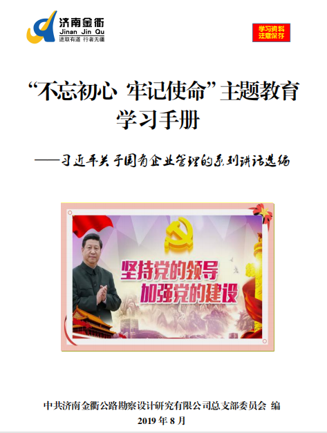 為扎實推進“不忘初心、牢記使命”主題教育深入開展,不斷總結(jié)提煉工作成果,切實抓好主題教育與本領(lǐng)域工作的深度融合,更好的促進黨員干部學習的自覺性和主動性,8月份,濟南金衢公路勘察設計研究有限公司編印了以“習近平總書記視察山東重要講話指示精神”、“關(guān)于國有企業(yè)改革管理系列講話”為主要內(nèi)容的學習手冊,作為公司主題教育學習輔導讀本,進一步豐富了學習載體。
