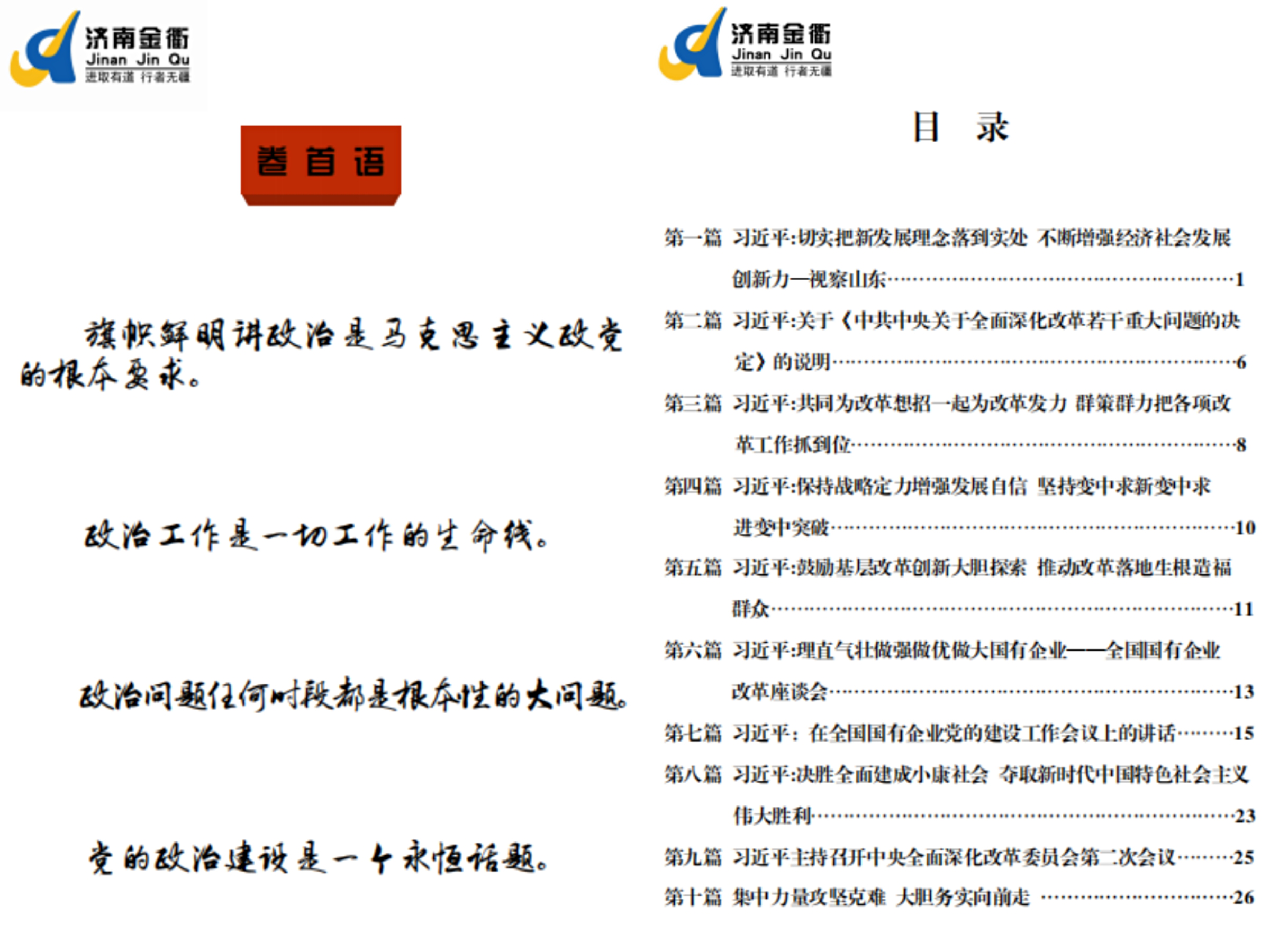 該學習手冊上共載編十篇,主要包含習總書記視察山東重要講話和國有企業(yè)改革兩個部分,系統(tǒng)選編了習總書記一系列重要講話和論述摘要,集中摘錄了與之相關(guān)的現(xiàn)場照片和工作素材,且小巧方便、利于攜帶,極大地方便了黨員干部隨時隨地可學、隨手隨處可看,為主題教育開展提供了有力參考,是一本集學習與宣講功能的工具書。