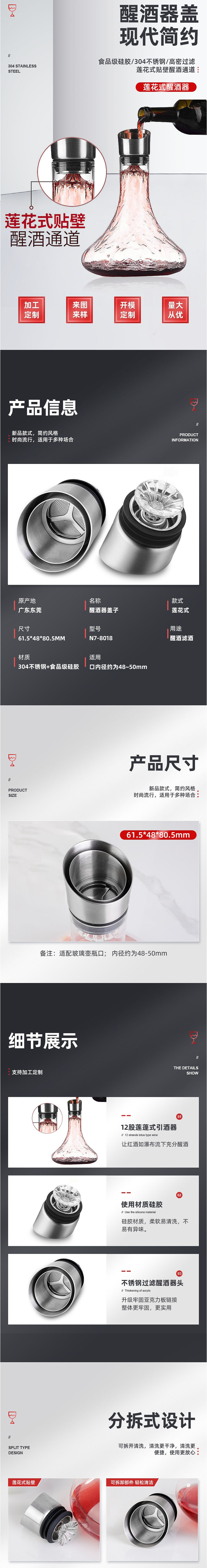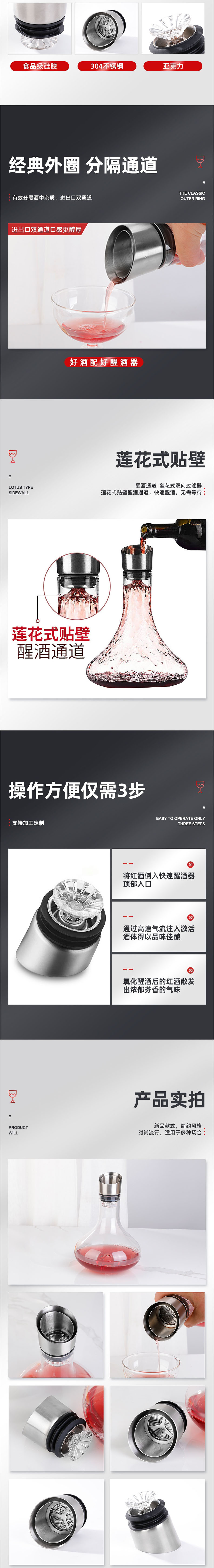 蓮花式貼壁醒酒通道:新品款式,簡約風格,時尚流行,適用于多種場合。12股蓮蓬式引酒器,讓紅酒如瀑布流下充分醒酒,使用材質硅膠。硅膠材質,柔軟易清洗,不易有異味。不銹鋼過濾醒酒器頭,升級牢固亞克力板鏈接整體更牢固,更實用。分拆式設計,可拆開清洗,清洗更干凈,清洗更便捷,使用更放心。經(jīng)典外圈分隔通道,分隔酒中雜質,進出口雙通道。蓮花式貼壁,醒酒通道蓮花式雙向過濾器,蓮花式貼壁醒酒通道,快速醒酒,無需等待。