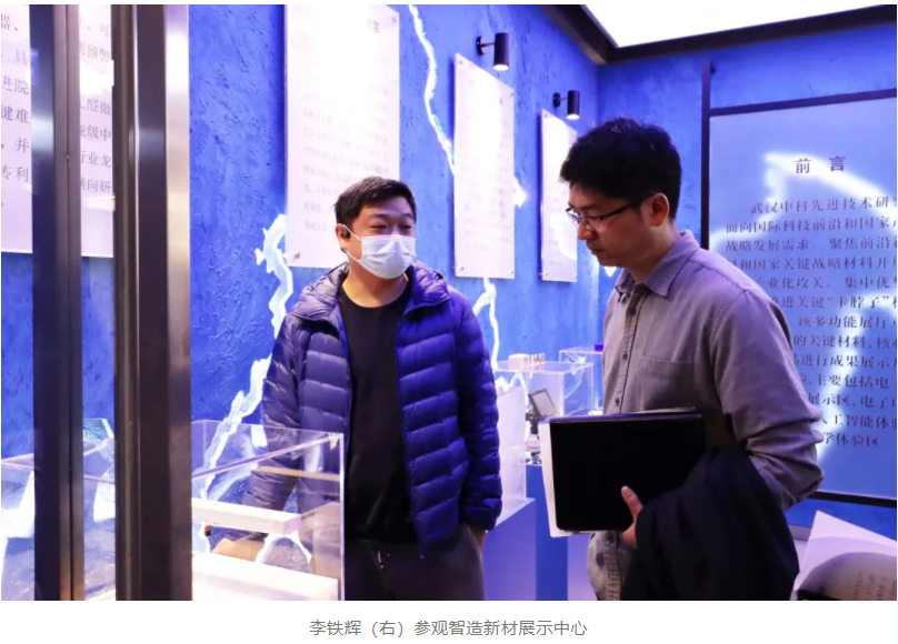 在智造新材展示中心,李鐵輝詳細了解了超表面材料涂層、黑磷、智能微膠囊、玄武巖纖維、等離子體設備等科研項目的科學原理、產業化進程以及專利成果,并參觀了實驗室。