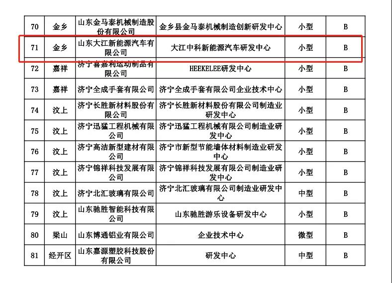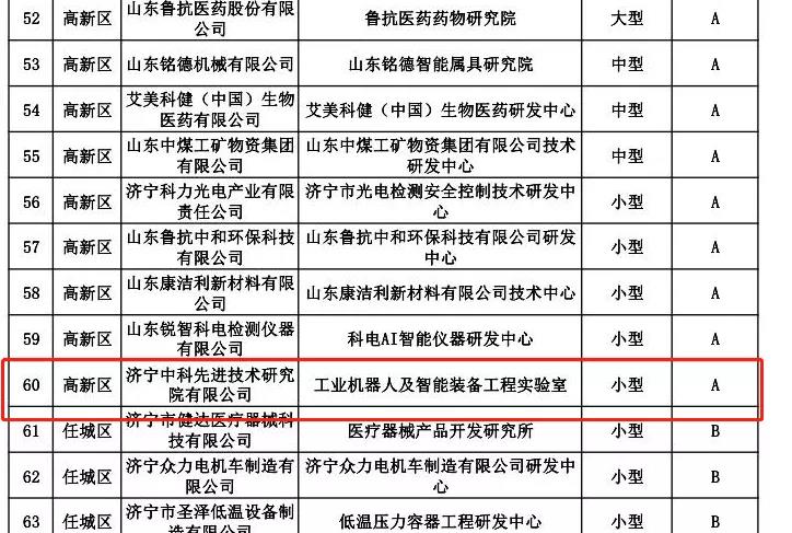 根據《濟寧市制造業企業研發機構培育提升三年行動計劃(試行)》(濟工信字〔2019〕95號)和《關于開展濟寧市第二批制造業企業研發機構遴選工作的通知》,經專家嚴格評審,濟寧市工業和信息化局公布了濟寧市第二批制造業企業研發機構名單,濟寧中科先進技術研究院“工業機器人及智能裝備工程實驗室”被認定為濟寧市第二批制造業企業A級研發機構。與山東大江新能源汽車有限公司聯合共建“大江中科新能源汽車研發中心”被認定為濟寧市第二批制造業企業B級研發機構。