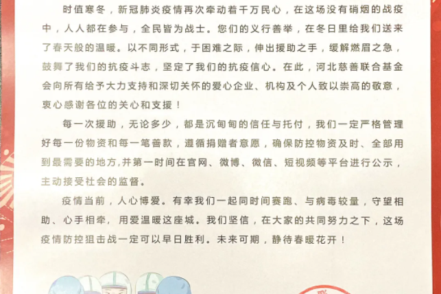 近日,武漢中科先進技術研究院收到河北慈善聯合基金會發來的感謝信,感謝我院在河北疫情防控工作中所作出的貢獻。 2021年新年伊始,河北省石家莊市、邢臺市等地發生新冠肺炎疫情。1月11日,武漢先進院捐贈出一萬支納米防霧噴劑給河北慈善聯合基金會,再由基金會轉交至一線醫護人員手中,助力疫情防控。 本次捐贈的納米防霧...