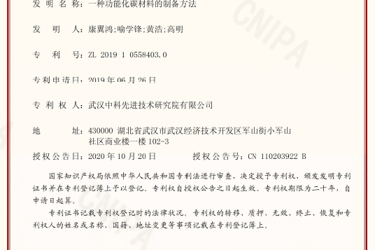 近日,武漢中科先進技術研究院獲得2項碳材料技術相關的中國發明專利授權!截至目前,今年武漢先進院新增授權發明專利已達11個。 發明專利“一種功能化碳材料的制備方法”利用碘單質對碳材料進行活化,同時碘單質輸運磷單質與碳發生反應,以制備出磷酸功能化碳材料。與現有制備方法相比,該方法新穎獨特、簡單高效,在不破壞...